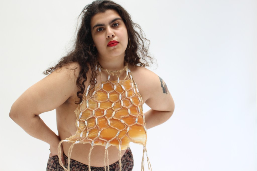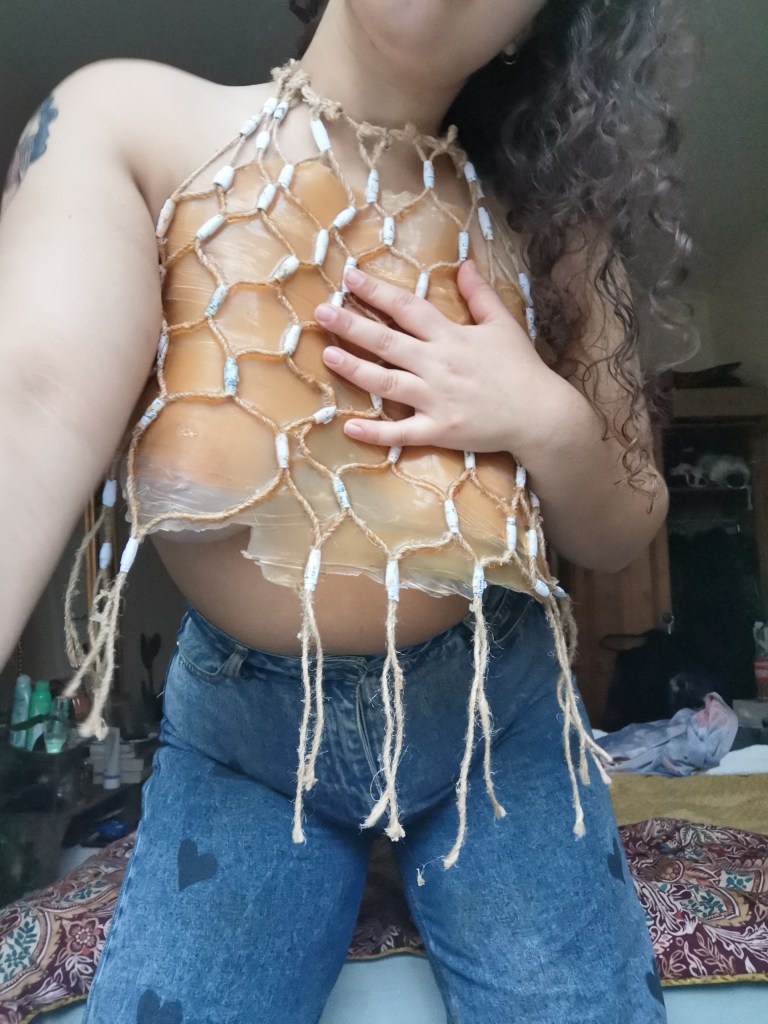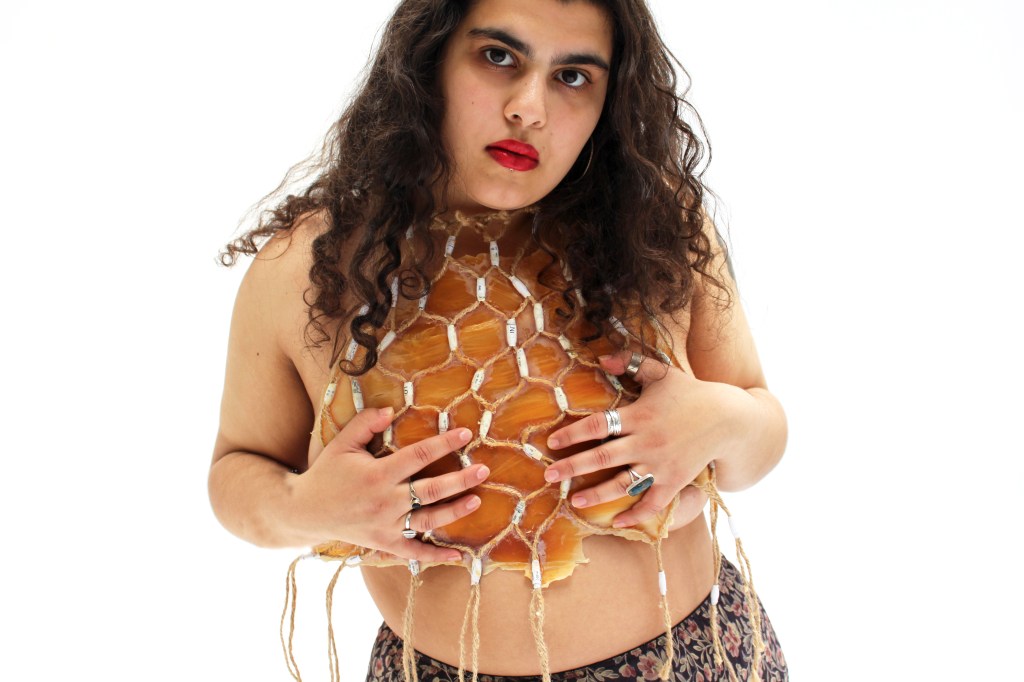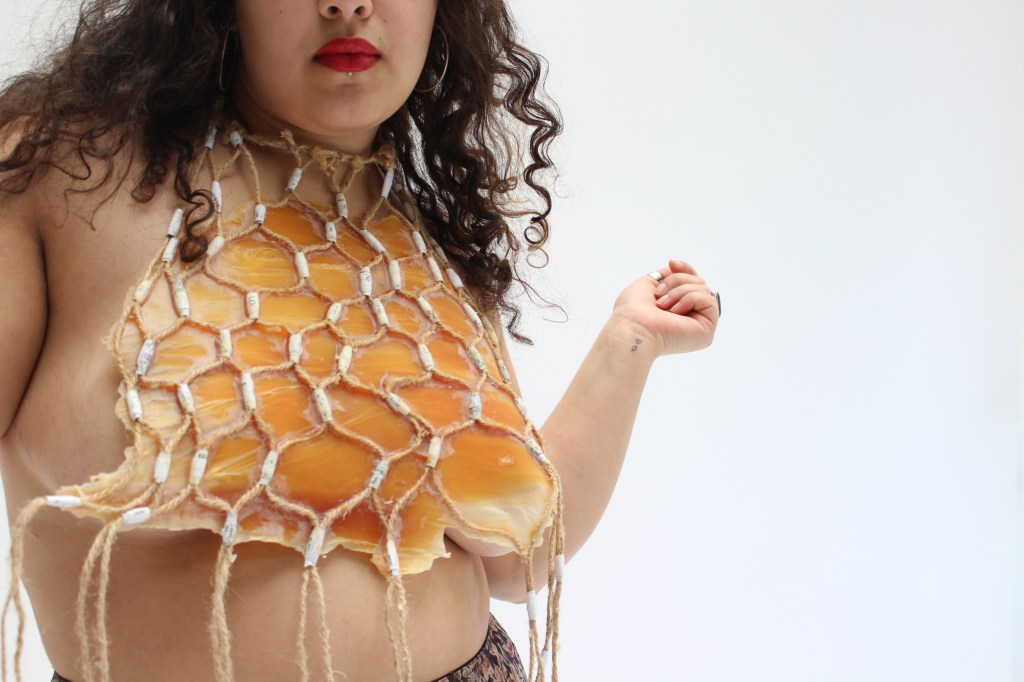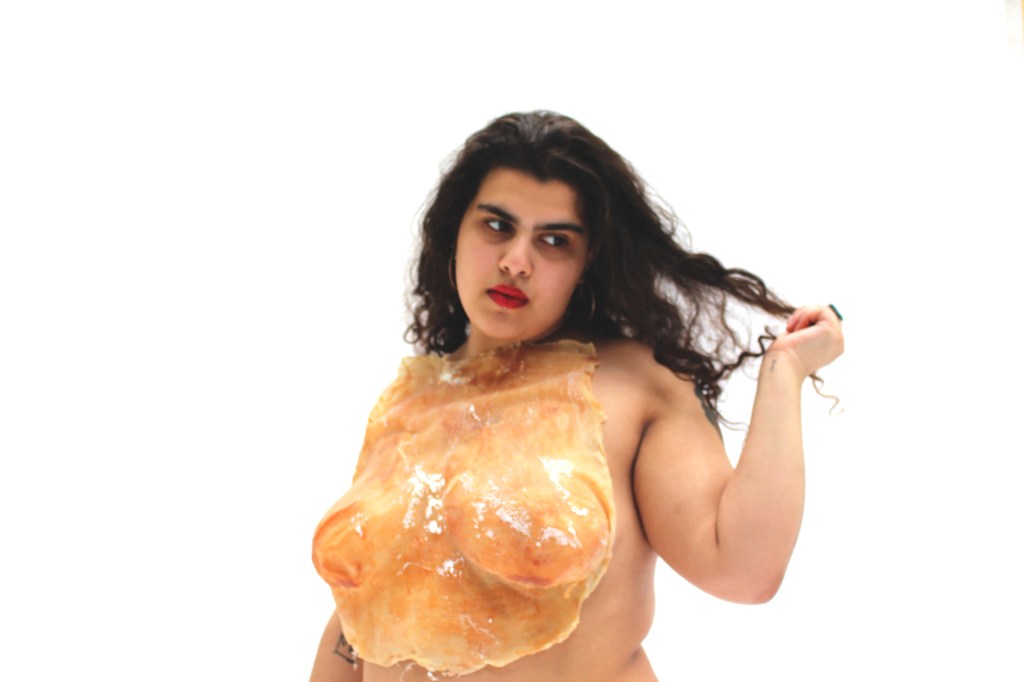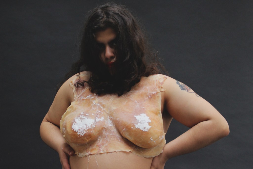 This work discusses the body through wearable latex pieces. A bulk of the works are sculpted from the artists body. This is done in order to demonstrate the artists complicated feelings of form. This can replicate personal trauma of the breasts as experienced in a medical context. The work is then evolved when it is worn by another person in performance. The wearer will experience wearing the skin of trauma while the viewer is forced to confront their uncomfort. Other latex pieces are free formed of structures made of ribbon, handmade beads and twine. These works are more focused on the artists experience of sexuality. They meditate on themes of oppression such as female nudity and lace up corsetry. These works reference as well as romanticise the body.