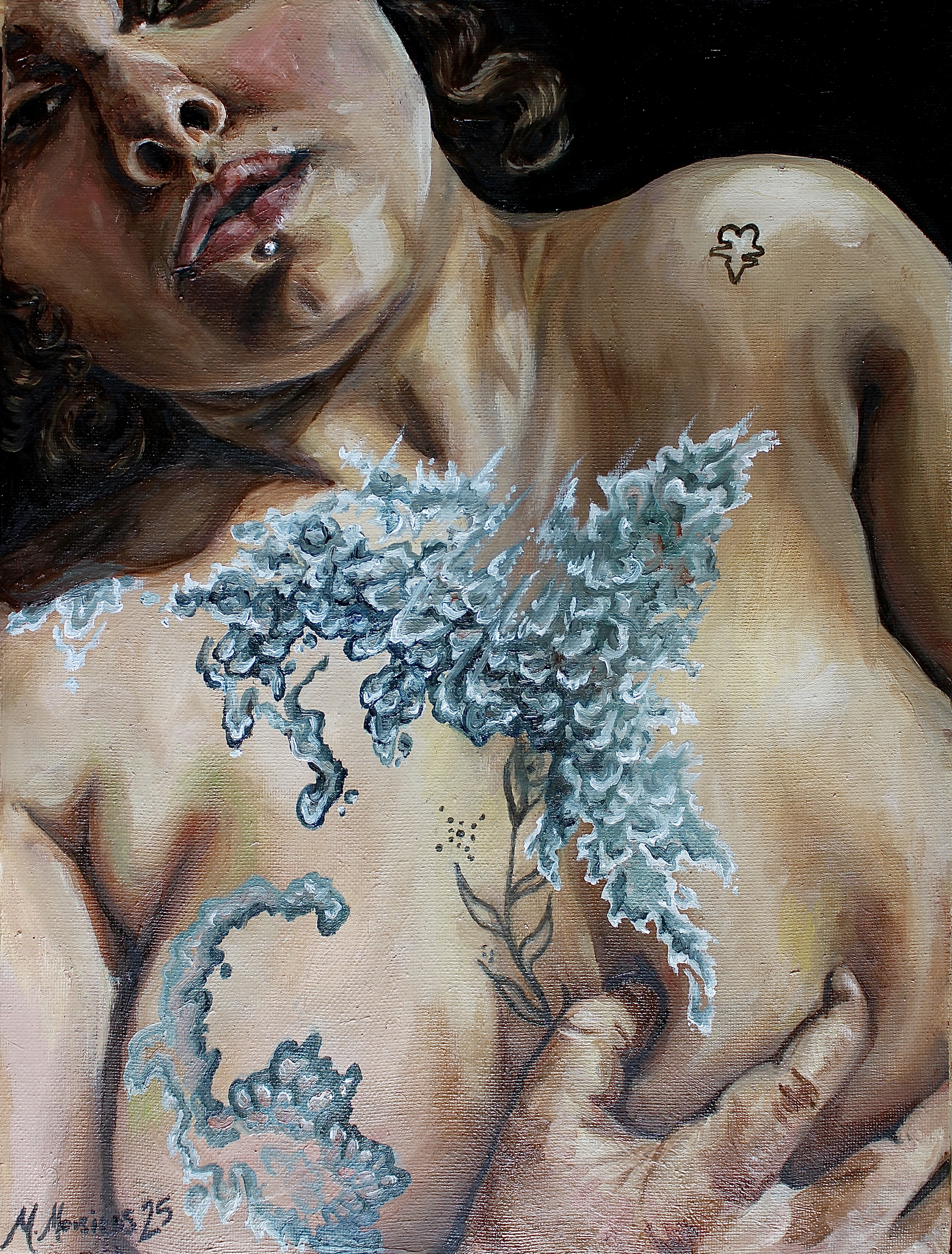 This series ‘I Feel Mould’ aims to connect the experience of chronic pain to the appearance of mould on self portraits of the artists. Mould being of a slow and subtle destructive nature, gross and not discussed. Much like the experience of chronic pain that many women have to suffer through while the medical industry does not accommodate for. Each portrait features depictions of mould on different sites to indicate where the artist feels pain as well as drawing on wider themes of a connection between income and pain, and the need to work worsening one’s symptoms.