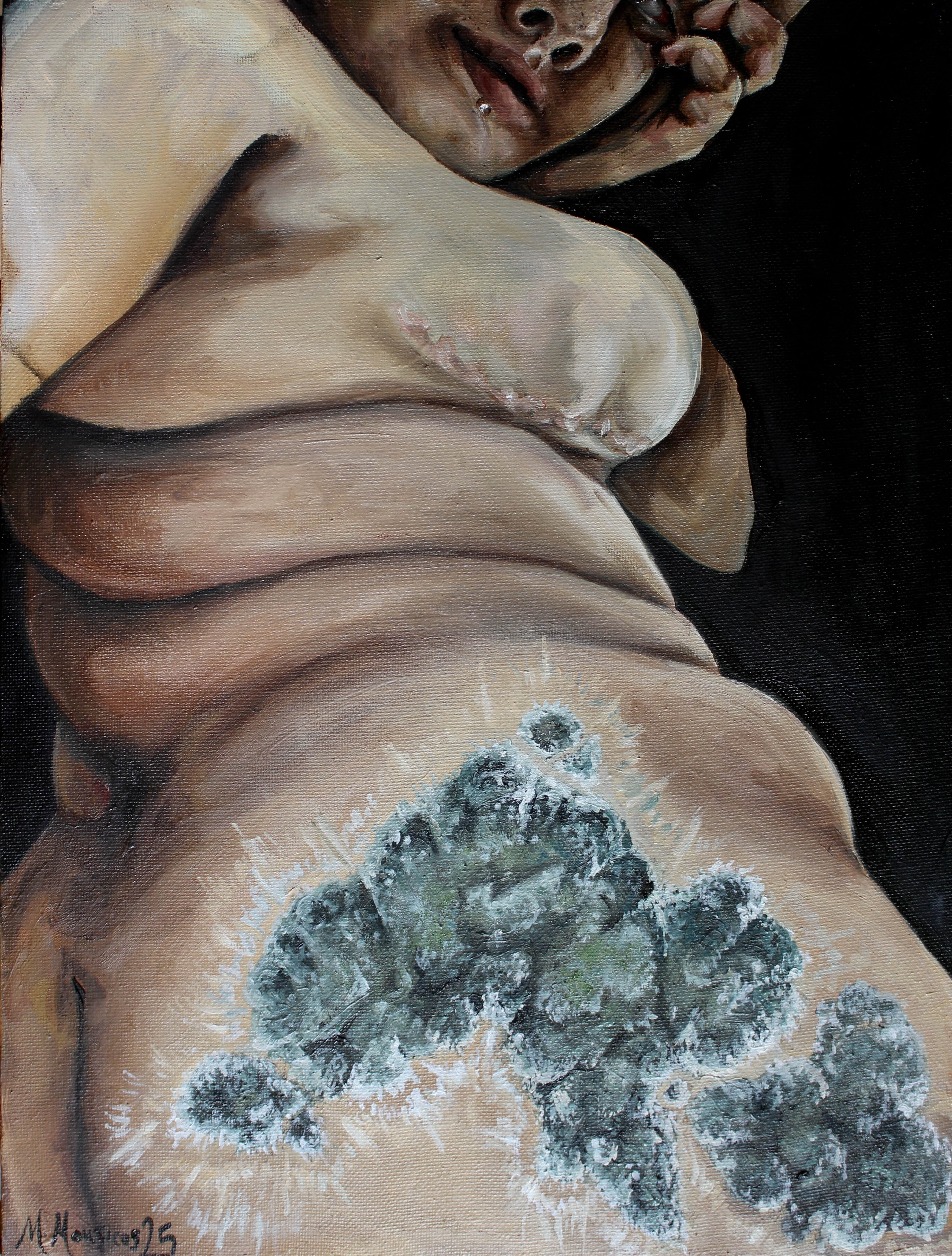 The 4th in the series is titled ‘Strong Independent Woman’. This verbiage can be seen as ‘empowering’ but is often rather restrictive and pandering. The attributes of absolute resilience, complete autonomy and confidence often means women have multiple burdens placed on them with no help. Then when a woman insists on her independence she is ridiculed, put down or dismissed – considered far from her femininity. Many women live with pain and chronic conditions, worsened by their responsibility that they must carry alone. Strong independent women are still gaslit by bosses and doctors, systemically unsupported and overlooked in their pain. This draws from the artist’s own experience, the irony of being labelled a ‘strong independent woman’ yet having their severe symptoms diminished. The mould is washing over the chest just the same as the pains of the artist’s body.
