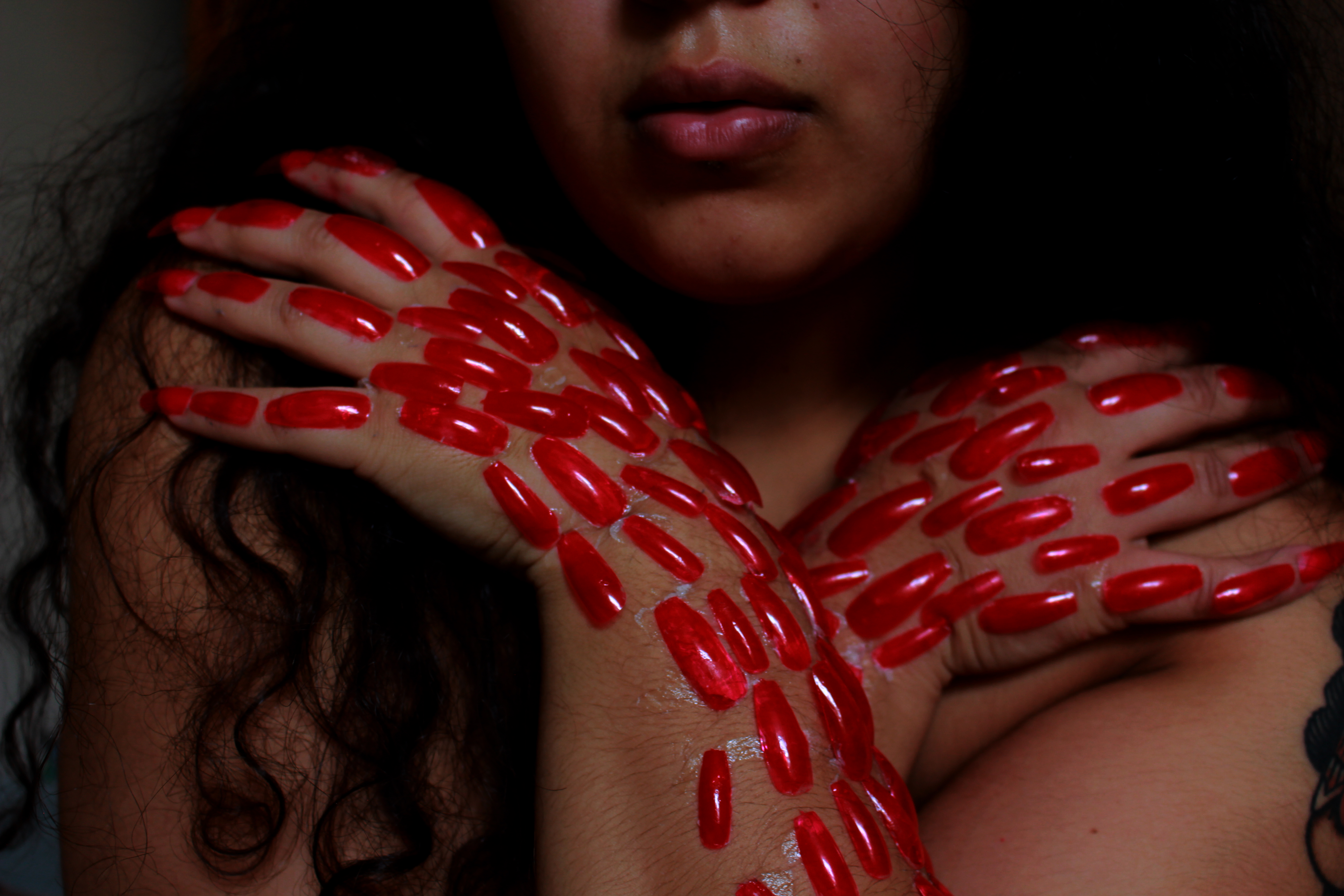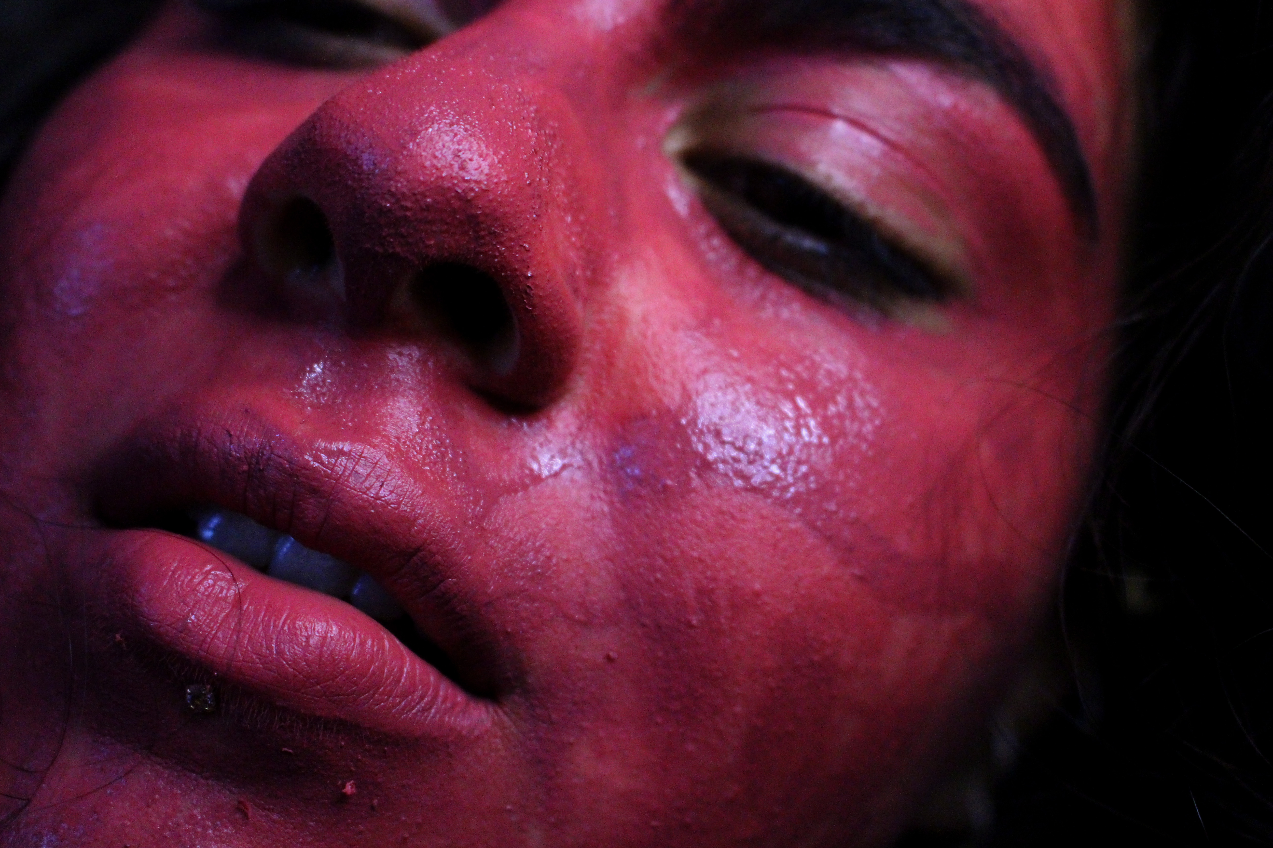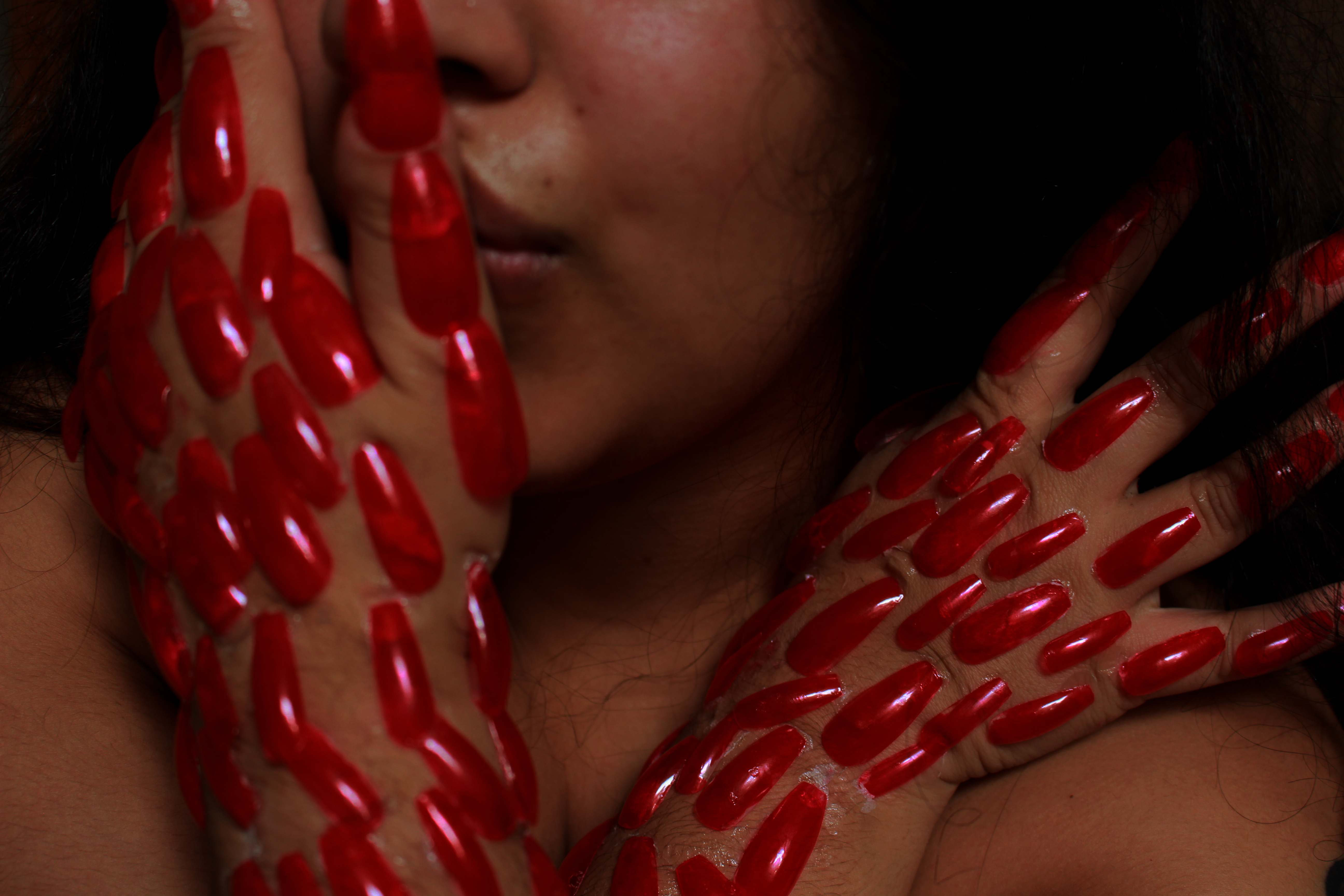 In this project Mousicos applies domestic ‘beauty products’ and glamorous items to herself and performs them with intent on highlighting their insidious meaning. The exaggeration and perversion of the use of these makeup items is done in service of creating an uncomfortable environment for the audience. Mousicos is intent on creating discomfort as a way to demonstrate her own complicated feelings on presenting gender as well as ideas of self-mutilation in the pretence of delivering ‘femininity’. The work takes on the subjects of body trauma, gender/queer identity and ‘hyper-femininity’. Mousicos’ works often strive to unnerve the viewer in order to confront their socialised and preconceived ideas surrounding norms and values.
