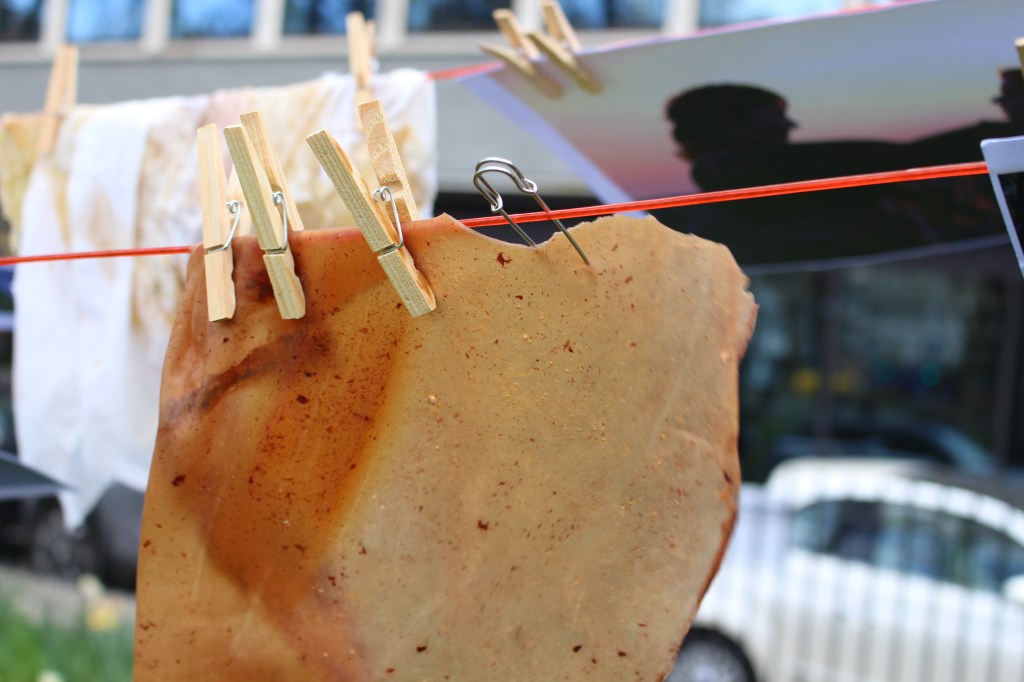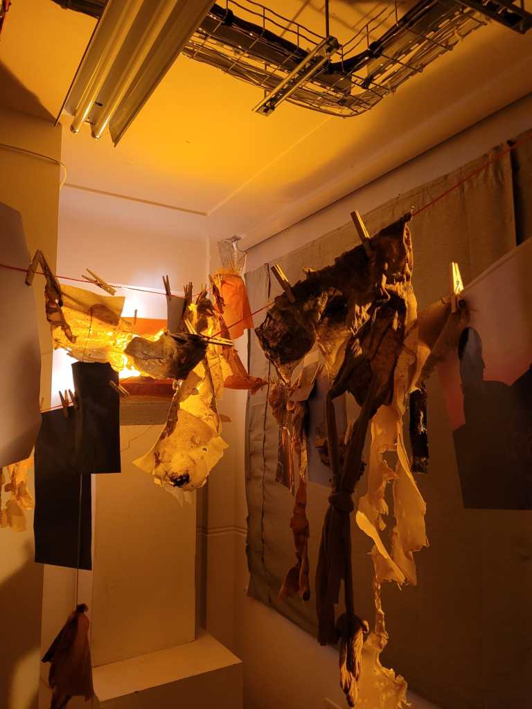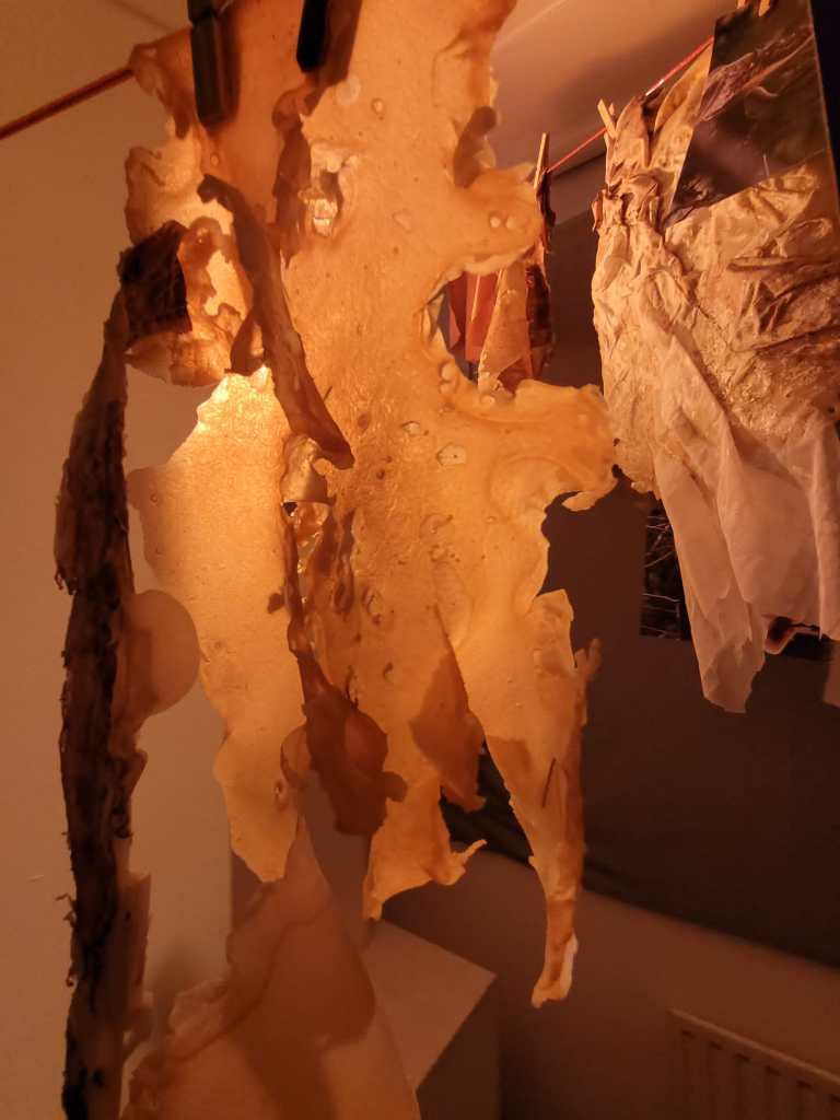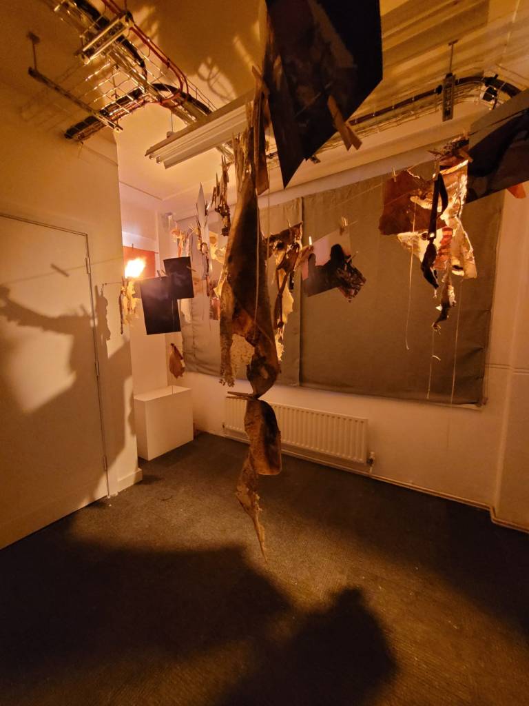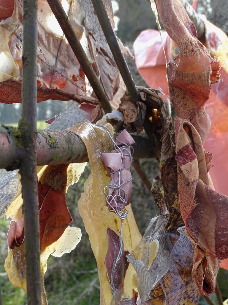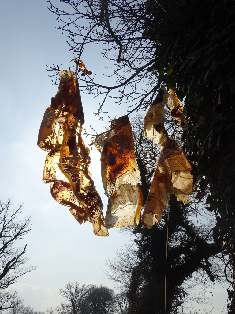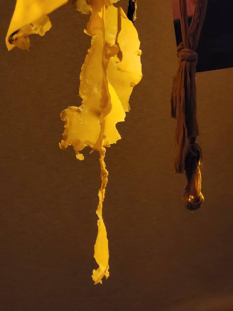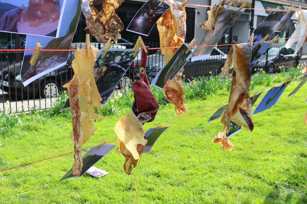 The work uses many materials, primarily latex mixed with natural made dye, wax, string, ribbon, fabrics, tea, paint and paper. All materials previously featured in each artist’s works. These pieces were then worn and photographed/performed in natural settings as contrast to the plastic natured latex. In performing, the works take on a personalised and ritualistic application. The viewer is able to plainly see how each artist physically and spiritually connects to the work.