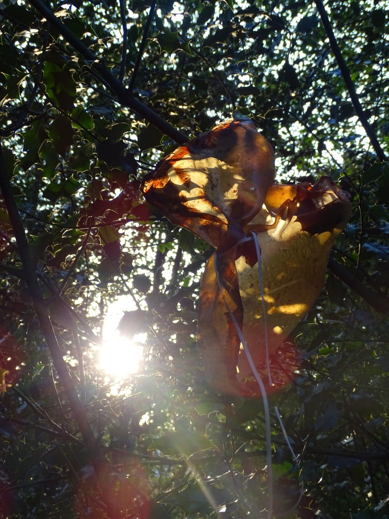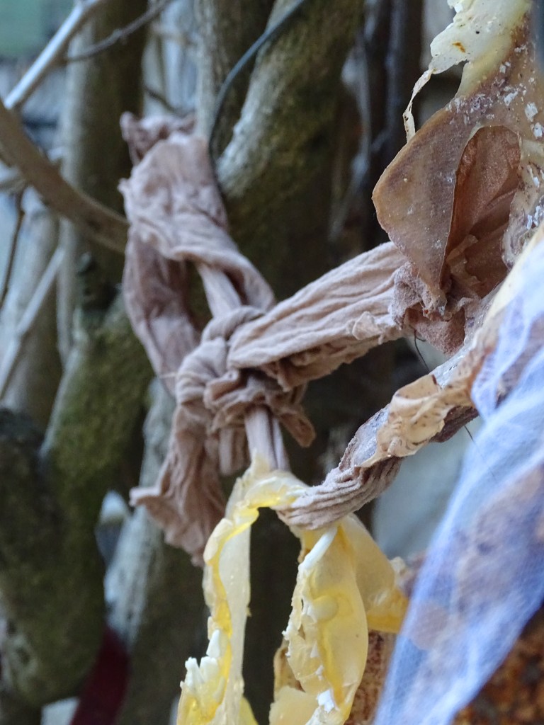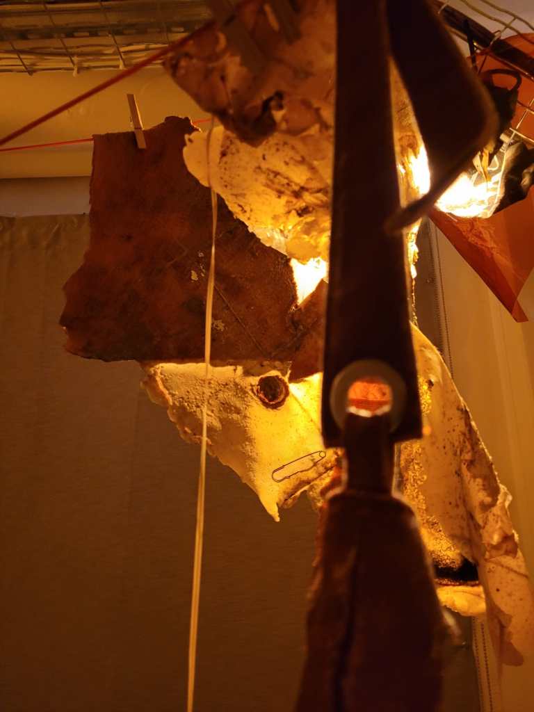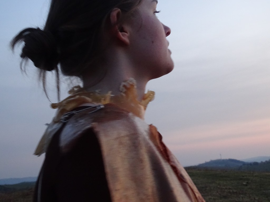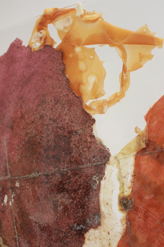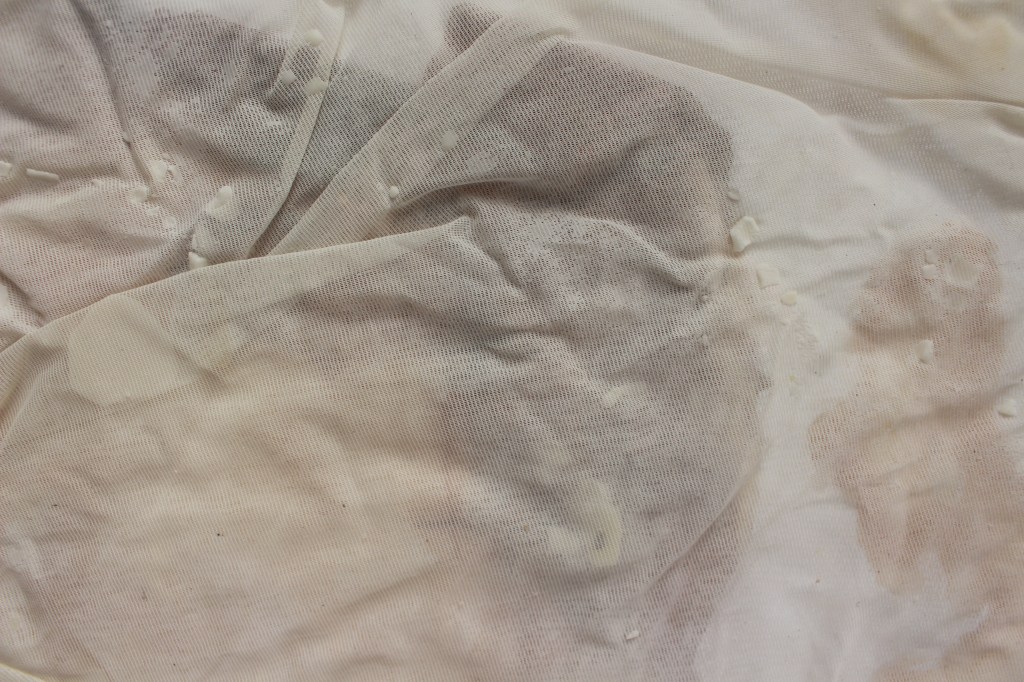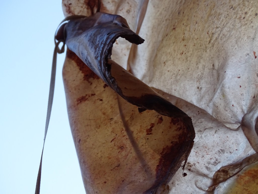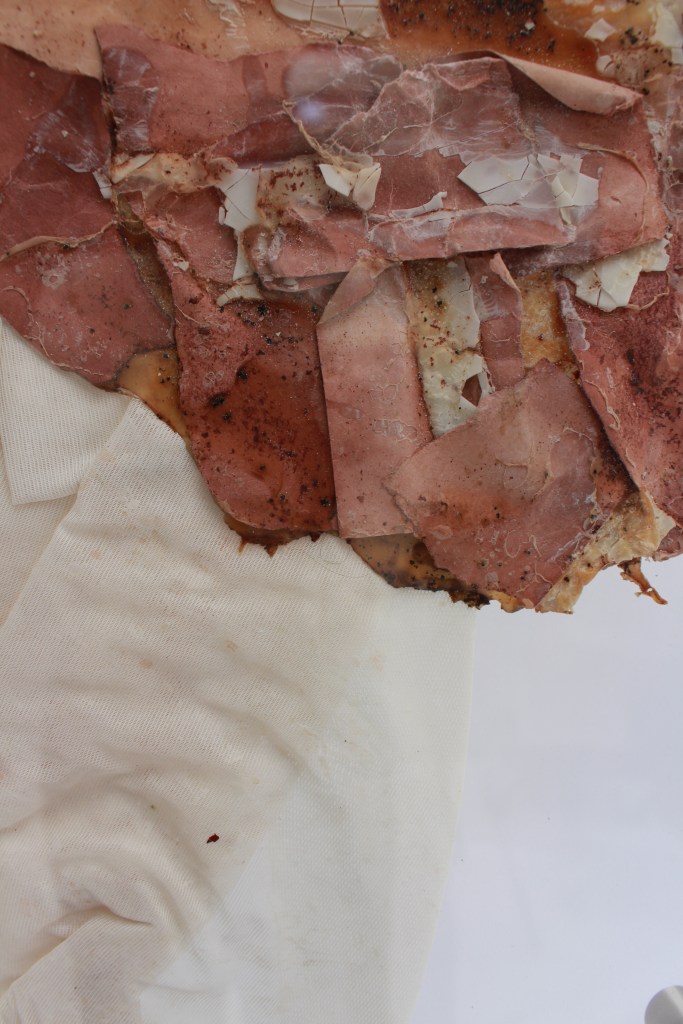 The work uses many materials, primarily latex mixed with natural made dye, wax, string, ribbon, fabrics, tea, paint and paper. All materials previously featured in each artist’s works. These pieces were then worn and photographed/performed in natural settings as contrast to the plastic natured latex. In performing, the works take on a personalised and ritualistic application. The viewer is able to plainly see how each artist physically and spiritually connects to the work.