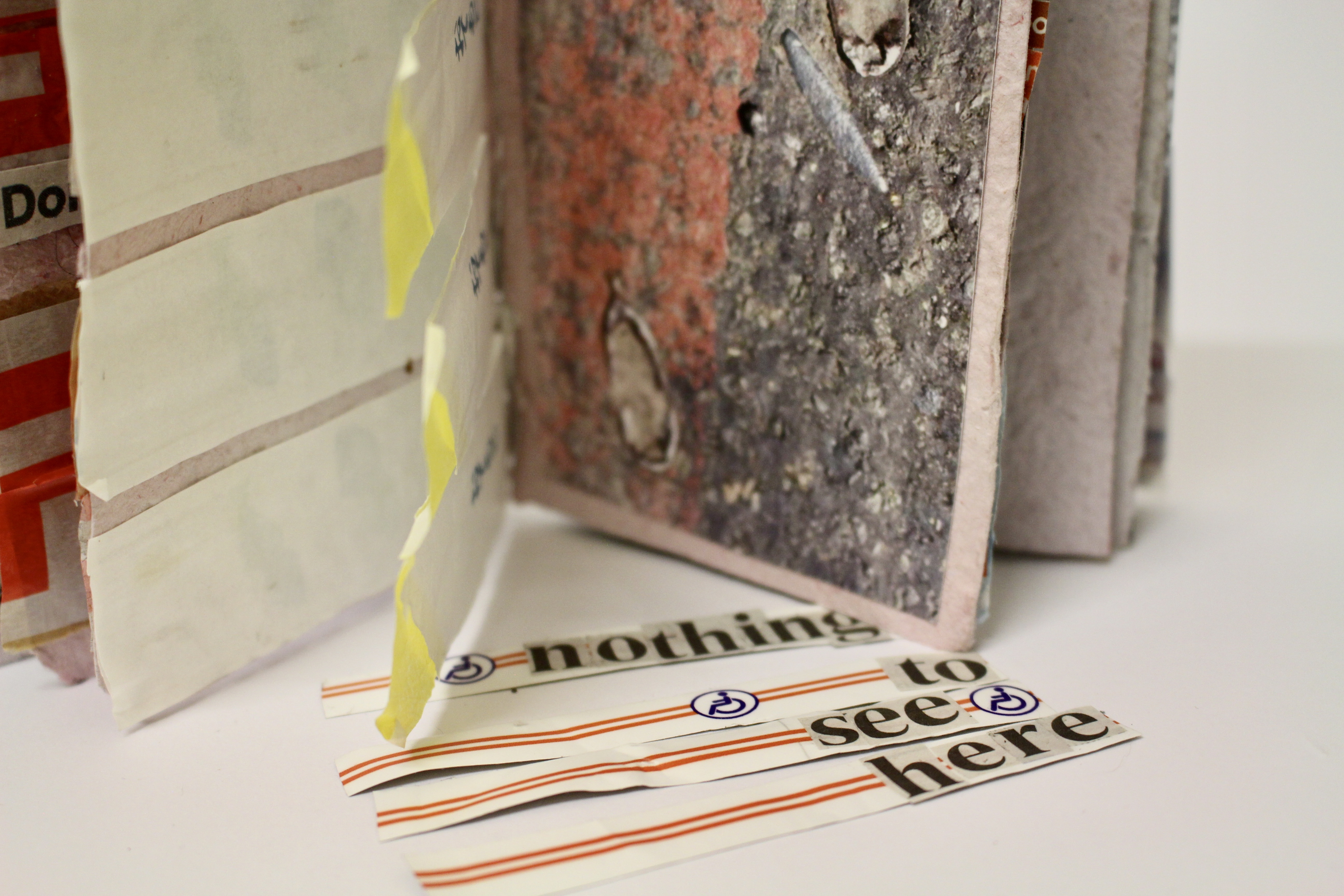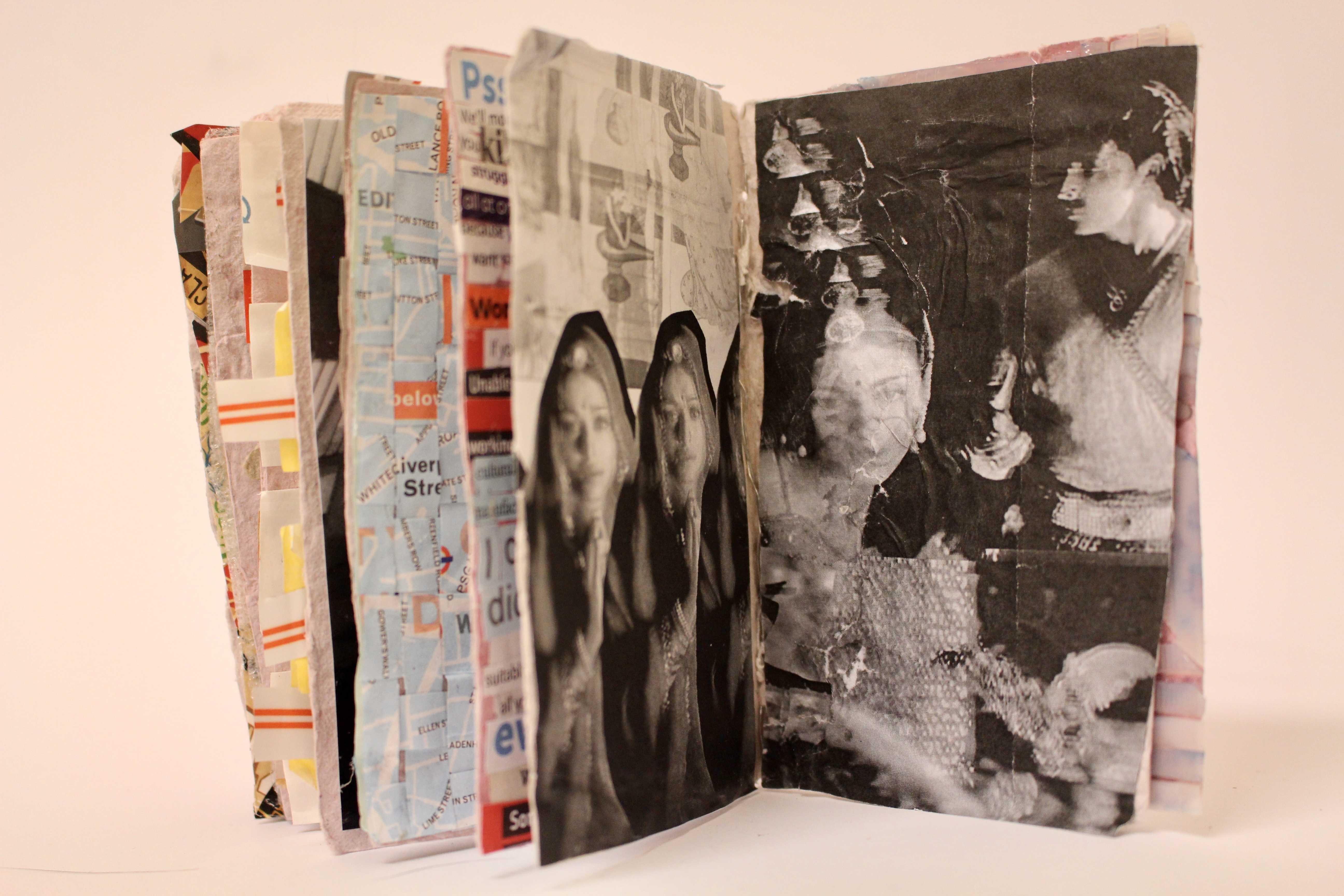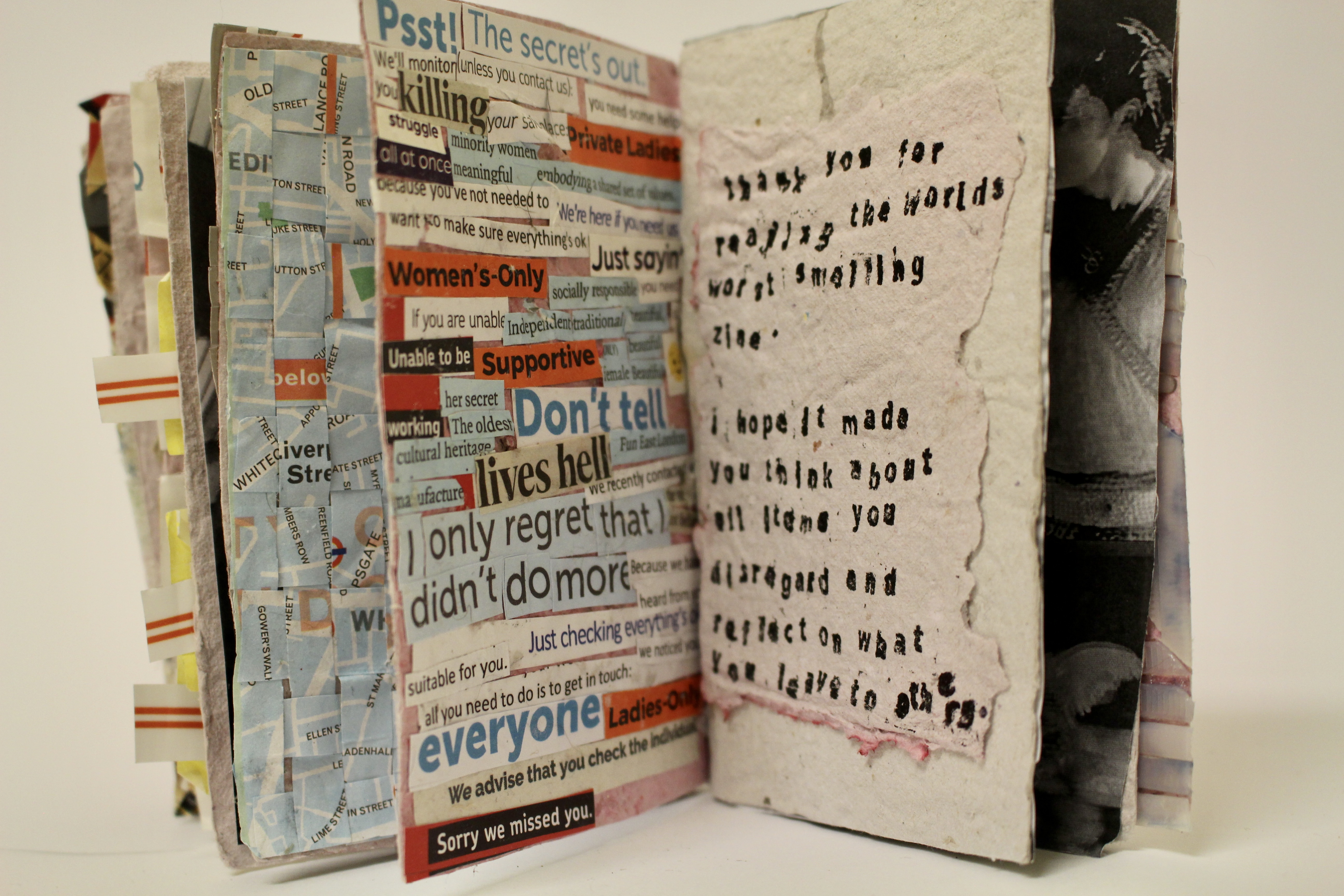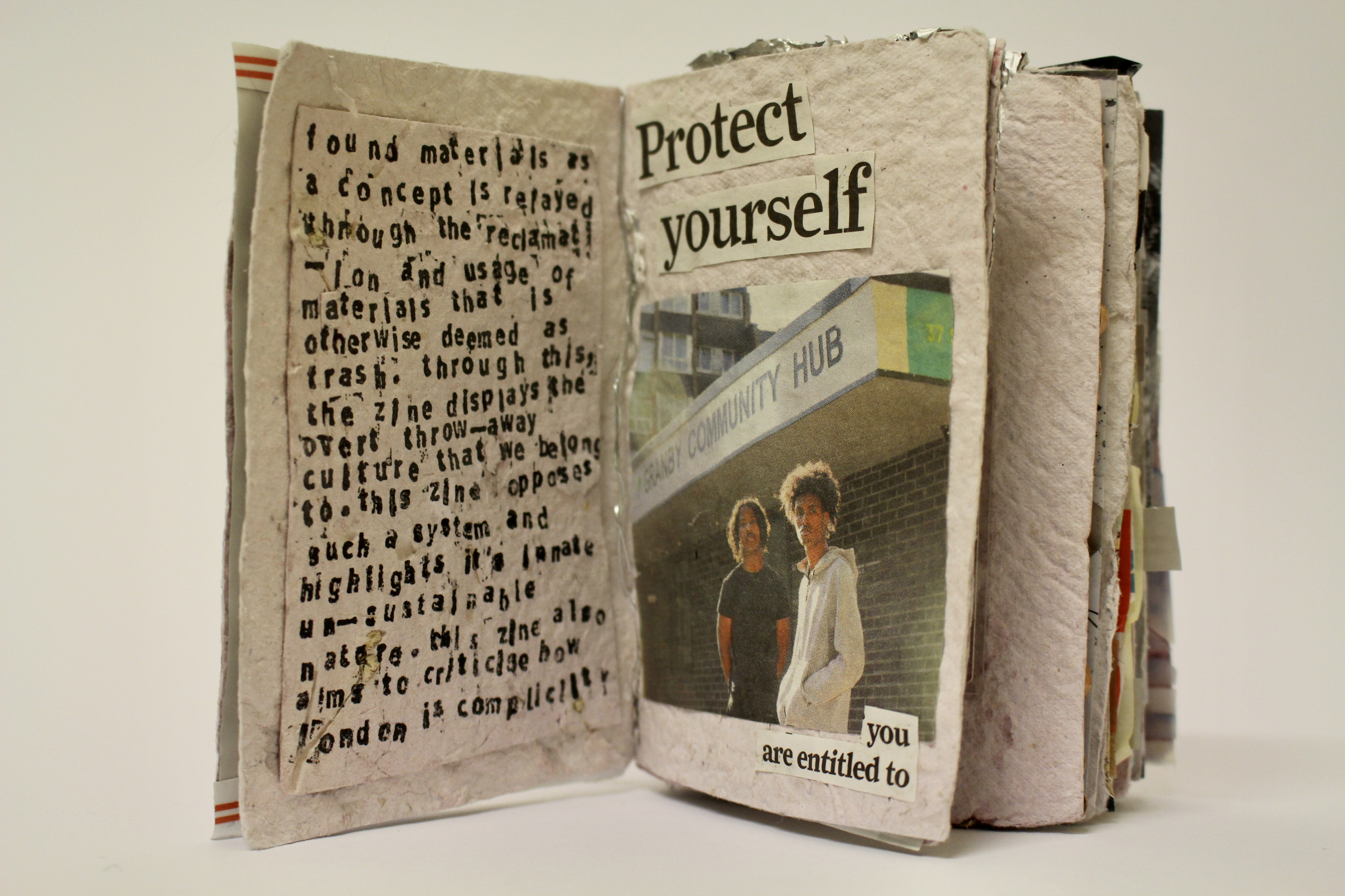 Mikaella Mousicos conceived the concept of her zine to be crafted entirely from found materials, inspired by her exploration of the lives of previous occupants of her flat through undelivered mail. Transforming these letters into paper, she ingeniously repurposed them as the foundation of her zine's pages. Every element, from binding to content, is crafted from found materials, most collected from the streets, symbolising a collection of abandoned materials reflective of London's transient nature. Rooted in the theme of "what we owe to each other," her zine delves into philosophical concepts inspired by T. M. Scanlon's work, exploring the dynamics of living in a shared urban environment and the conscious and unconscious legacies we impart. Environmental concerns are also woven into the narrative, highlighting the recycled nature of the materials and their implications for future generations. Mikaella's creative process involves curating street finds and assembling them into thought-provoking photo montages, capturing the ephemeral essence of urban life. She acknowledges the inherent adaptability of her medium, drawing inspiration from diverse sources such as local newspapers, pamphlets, and discarded books, ensuring each issue of her zine is a unique exploration of common themes. This sentiment extends to the binding, which utilizes repurposed zip ties found at building sites as well as ink made from burnt found paper, further underscoring the zine's ethos of transforming discarded objects into meaningful artifacts.Embracing the whimsical nature of her materials, Mikaella opted for a title crafted from words that resonate with her message, symbolizing both the constraints and freedom inherent in her creative endeavor.